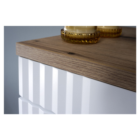 V první řadě zaujme umyvadlová skříňka Fiji s deskou a umyvadlem 60 cm dub coast evoke/bílá, která přináší dokonalou kombinaci přírodního dřevěného dekoru a čistě bílého povrchu. Skříňka nabízí dostatek úložného prostoru a díky svému minimalistickému designu působí lehce a moderně.