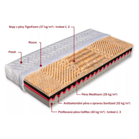TIP Vyspimese. CZ:Nakupte u nás novou matraci a my vás zbavíme té staré.Více informací Matrace Dřevočal Tigris + polštář zdarmaPrémiová matrace, která spojuje pohodlí, odolnost a hygienu. Vhodná pro náročné spáče, kteří požadují ergonomii, volbu tvrdosti a zdravé mikroklima.Jedna matrace, dva světy tvrdosti Měkčí strana: studená pěna TigerFoam (37 kg/m³), tvarovaná do nopů pro maximální pružnost, vzdušnost a pohodlí.Tvrdší strana: pěna Cellflex (40 kg/m³) s ventilačními kanálky – perfektní podpora a vysoká tvarová stálost.Střed jádra tvoří pěna MediFoam (35 kg/m³) a antibakteriální Sanitized (32 kg/m³) pro hygienické prostředí.Výška 25 cm, nosnost 130 kg, tvrdost 2 a 3 dle zvolené strany.Snímatelný a pratelný potah, ekologické lepidlo na vodní bázi.Vzdušná matrace s antibakteriálním jádremDíky otevřené struktuře buněk a průduchům v jádru matrace dochází k účinnému odvodu vlhkosti a tepla. Pěna Sanitized navíc chrání před bakteriemi a plísněmi.Ortopedická podpora a pohodlíSedmizónové jádro se přizpůsobí tělu v každé spánkové poloze. Napomáhá správné pozici páteře a zmírňuje tlak na exponovaná místa – ideální i při bolestech zad.Flexibilní komfort bez kompromisůPřetočením matrace si zvolíte měkčí nebo tvrdší stranu – bez nutnosti kompromisu. Ideální volba pro páry s rozdílnými preferencemi nebo pro ty, kdo rádi mění podmínky. Kam matraci Tigris umístit? Univerzální pohodlí bez kompromisů – díky výšce 25 cm si tato matrace skvěle rozumí s jakýmkoli typem roštu. Ať už máte klasický pevný rošt, pružný lamelový nebo moderní polohovací, vždy poskytne maximální komfort a oporu.Na výběr ze 6 druhů pratelných snímatelných potahů, které lze rozdělit na dvě půlky: ÚpletÚplet je univerzální potah vhodný pro kohokoli. Díky gramáži 250 g/m3 jej řadíme mezi kvalitní. Má pěkné prošívání, což nejenže dobře vypadá, ale díky hustšímu prošití středu i déle vydrží.Potah je ze 100% polyesteru, který zajistí dokonalou elasticitu, rychlé schnutí a vysokou prodyšnost.Údržba potahu z úpletuRozdělitelný na 2 poloviny pomocí zipu.Praní na 60 °C.Sušit volně.Složení100 % polyesteru: dodává elasticitu, kopíruje pohyb matrace, nevytahuje se.60 °C praníprádelní šňůra sušeníAloe VeraTento potah o gramáži 250 g/m3 si zamilují všichni, kteří chtějí matraci chránit před bakteriemi a viry. Základem je polyester obohacený o výtažek z rostliny aloe vera. Ta zajistí nejen antibakteriální vlastnosti, ale dokonce zabrání nepříjemným pachům.Potah Aloe Vera je velmi efektně prošitý. Prostřední část je hustěji protkaná, což zajistí delší životnost.Údržba potahu Aloe VeraRozdělitelný na 2 poloviny pomocí zipu.Praní na 60 °C.Sušit volně.Složení99 % polyesteru: dodává elasticitu, kopíruje pohyb matrace, nevytahuje se.1 % polyamidu: dodává potahu pevnost, odolnost proti oděru a dlouhou životnost. Je odolnější proti žmolkování.60 °C praníprádelní šňůra sušeníSilverGuardJeden z nejlepších potahů o gramáži 250 g/m3 je SilverGuard. Je velmi příjemný na dotek a díky obsahu stříbra chrání před houbami, bakteriemi a zápachem. Tato ochrana vydrží po celou dobu životnosti matrace, a to i přes časté praní. Zároveň je svým složením odolný proti žmolkování.Na dotek je potah SilverGuard velmi jemný, obsah přírodního viskózového vlákna dodává celému potahu luxusní vzhled a zároveň udržuje celé lůžko hygienicky čisté.Údržba potahu SilverGuardRozdělitelný na 2 poloviny pomocí zipu.Praní na 60 °C.Sušit volně.Složení63 % polyesteru: dodává elasticitu, kopíruje pohyb matrace, nevytahuje se.35 % viskózy: přírodní materiál, který zajistí optimální výměnu tepla.2 % polyamidu: dodává potahu pevnost, odolnost proti oděru a dlouhou životnost. Je odolnější proti žmolkování.60 °C praníprádelní šňůra sušeníLyocellPotah Lyocell má hedvábný lesk a na dotek je příjemně měkký. Budete jej milovat, pokud se v noci hodně potíte, protože má vysokou absorpční schopnost a zároveň rychle odpařuje přebytečnou vlhkost.Potah má v sobě mikrovlákna zvaná Lenzing Lyocell, která zabraňují tvorbě mikroorganismů a zajistí, že vaše lůžko bude dokonale čisté.Údržba potahu SilverGuardRozdělitelný na 2 poloviny pomocí zipu.Praní na 60 °C.Sušit volně.Složení62,25 % polyesteru: zajišťuje elasticitu, kopíruje pohyb matrace, nevytahuje se.37,75 % viskózy: přírodní materiál, který zajistí optimální výměnu tepla.60 °C praníprádelní šňůra sušeníMedicottPotah Medicott je ideální pro alergiky. Obsahuje účinnou složku, která zabraňuje vzniku plísní a přežití prachových roztočů. To vše zajistí přírodní cestou, tedy bez chemických látek. Své vlastnosti získává Medicott tak, že výrobce bavlnu dokonale vyčistí, čímž zamezí tvorbě plísní.Samotný potah vás okouzlí svou měkkostí a pružností. To proto, že obsahuje 40 % bavlny. Zároveň je prošitý vrstvou dutého vlákna, které zajistí ještě větší pohodu při spánku.Údržba potahu MedicottRozdělitelný na 2 poloviny pomocí zipu.Praní na 60 °C.Sušit volně.Složení40 % bavlny: jemné vlákno, které má dlouhodobou životnost a chrání před chladem.35 % polyamidu: dodává potahu pevnost, odolnost proti oděru a dlouhou životnost. Je odolnější proti žmolkování.25 % polyesteru: zajišťuje elasticitu, kopíruje pohyb matrace, nevytahuje se.60 °C praníprádelní šňůra sušeníLevandulePotah s výtažky z levandule si zamiluje každý, protože je prospěšná pro náš organismus. Ať už pro své protizánětlivé, či repelentní účinky. Materiál potahu je díky obsahu tencelu velmi jemný na dotek, v lét
