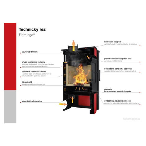 Krbová kamna HS Flamingo MELAND jsou díky své vysoké kvalitě a velmi rozumné ceně velice žádaným artiklem teplovzdušných kamen na Českém i Evropském trhu. Krbová kamna HS Flamingo nabízejí standardní možnost externího napojení přívodu vzduchu. Pro co nejefektivnější spalování je přivedený vzduch dále rozdělen na primární (pod rošt), sekundární na oplach skla a terciální pro podporu spalování plynných částic. Komora je vykonstruovaná tak, aby byla dosažená vysoká účinnost a malá spotřeba paliva, která činí průměrně 2kg na hodinu. Vnitřek spalovacího prostoru tvoří český šamot a litinový rošt. Díky tomu je komora téměř nesmrtelná. Kamna jsou vyrobena z 3 a 5 mm plechu, kde 5mm plech je použit převážně na spalovací komoru. Díky tomu poskytujeme na krbová kamna záruku 5 let.