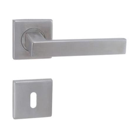 Populární celonerezová klika hranatého vzhledu na hranatých rozetách. Spodní rozeta na dozický klíč.