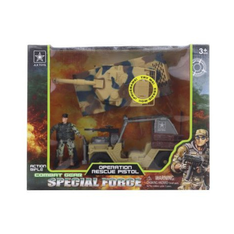 Plastová vojenská sada obsahuje terénní auto, tank (jezdí a vydává zvuky - napájení na 3 AG13 baterie, které jsou součástí balení) a vojáčka. Rozměry balení cca 32 x 25,5 x 10,5 cm. Věk 3+