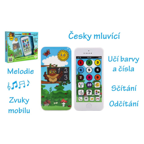 Dotykový mobil, se kterým se děti naučí barvy, čísla, sčítání a odčítání. Dále mohou poslouchat melodie známých českých písniček a numerickou klávesnici použít jako piánko. Na mobilu jsou tlačítka se zvukem vyzvánění, ukončení hovoru a příchozí zprávy. Je šetrný ke sluchu dětí, rozvíjí slovní zásobu, představivost a logické myšlení. Zdokonaluje jemnou motoriku, rozvíjí zrak a sluch aktivním zapojením do hry. Součástí je atraktivní kryt s motivem moudré sovy. Vhodné pro děti od 12 měsíců. Baterie 3x AG13 jsou součástí výrobku.