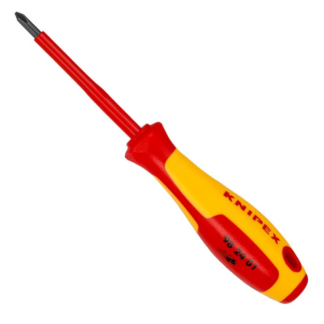 Elektrikářský křížový šroubovák s profilem Philips, izolovaný do 1000V, různé velikosti a délky – KNIPEXProfesionální šroubovák určený k práci na elektrických zařízeních, montáž a demontáž vodičů apod. – pro práci pod napětím do 1000 V. Izolováno v celé délce nástroje pro maximální ochranu uživatele. Dvoukomponentní ergonomická rukojeť pro pohodlné držení při práci.Šroubováky splňují normy IEC 60900 a DIN EN 60900. Tvarování rukojeti zabraňuje samovolnému kutálení, rukojeť navíc disponuje otvorem pro zavěšení na zeď, skříň apod. Některé velikosti mají na výběr ze dvou variant: standardní a zúženou verzi, která má snížený průměr izolace čepele pro zapuštěné pružinové a šroubové prvky.