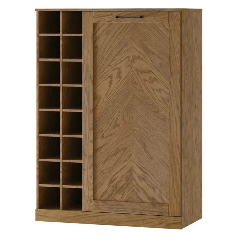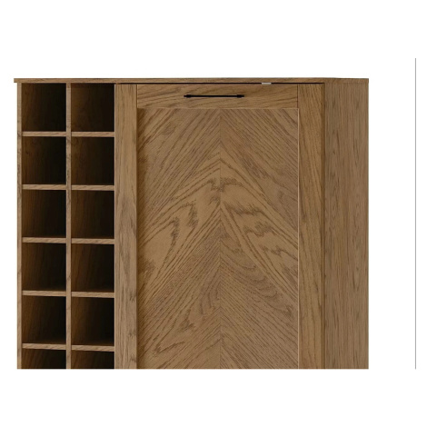Design komody se vyznačuje výraznými detaily, jako je úchytka v matně černé barvě a jemný motiv rybích kostí na předních dveřích. Bar a jeho přední čela jsou vyrobena z masivního dřeva doplněného kvalitní nábytkovou deskou s přírodní dubovou dýhou, která nejen vypadá skvěle, ale je i odolná a snadno udržovatelná.