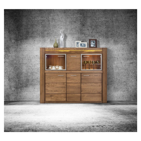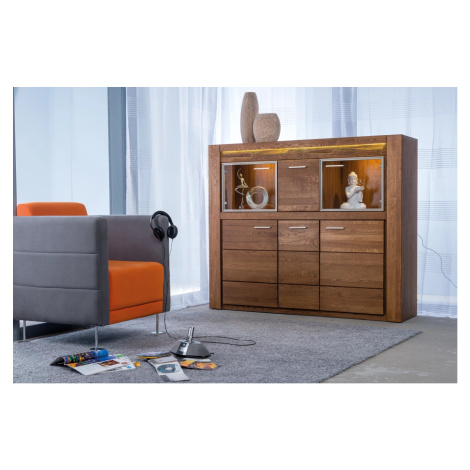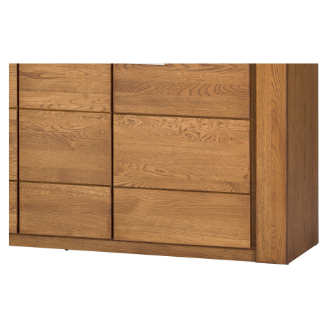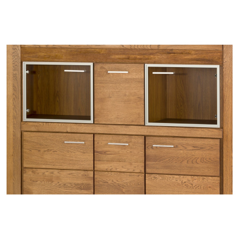 Šestidveřové provedení nabízí nejen estetický půvab, ale také praktický úložný prostor pro veškeré potřebné předměty. Za dvířky se ukrývají prostorné police, které poskytují dostatek místa pro uložení všeho, co chcete mít po ruce. Ve dvou částecj najdete prosklená dvířka, která dají vyniknout vystaveným dekoracím Jemné kovové úchytky dodávají komodě moderní a decentní kontrast k přirozené struktuře dřeva.