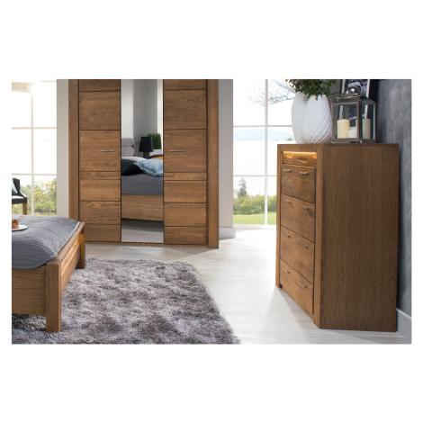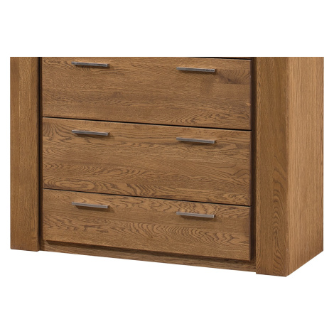 Zásuvkové provedení nabízí nejen estetický půvab, ale také praktický úložný prostor pro veškeré potřebné předměty. Šuplíky jsou praktické k uschování spodního prádla nebo jiných drobností. Jemné kovové úchytky v černém provedení dodávají komodě moderní a decentní kontrast k přirozené struktuře dřeva.